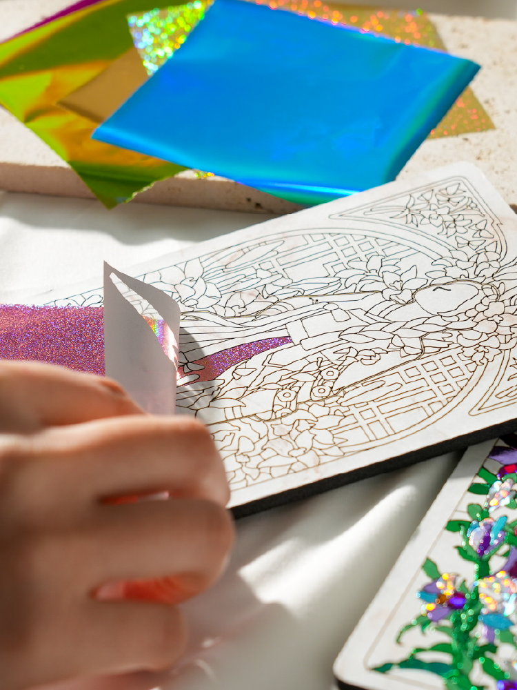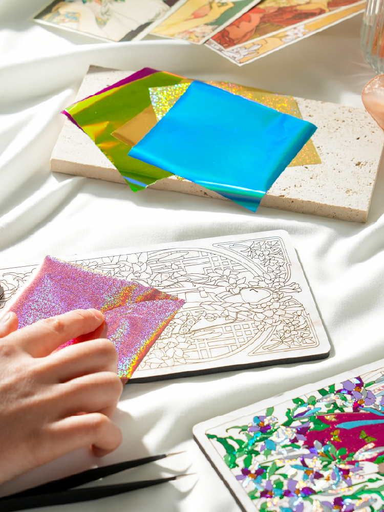 The holographic foil sheets act like "paint" for your Glitting artwork!