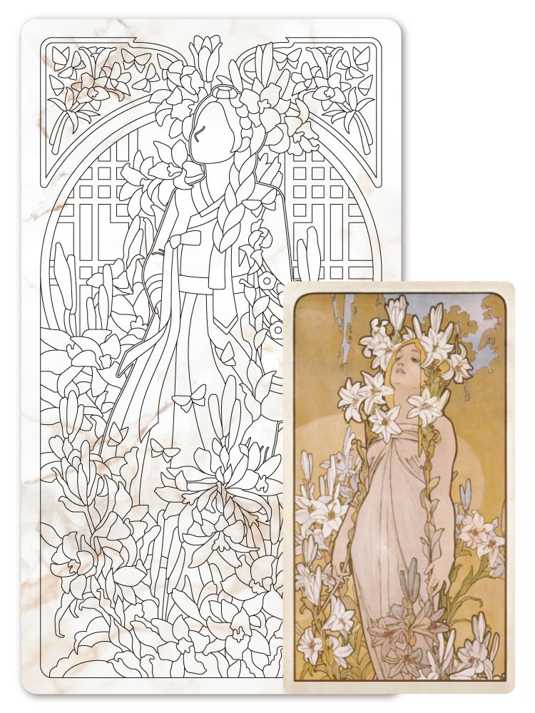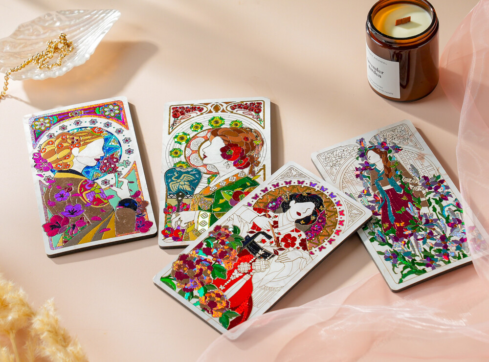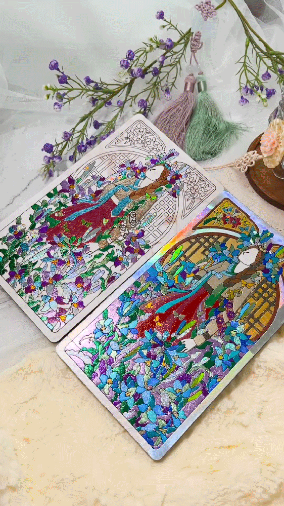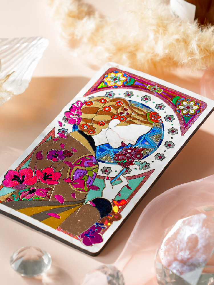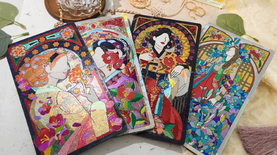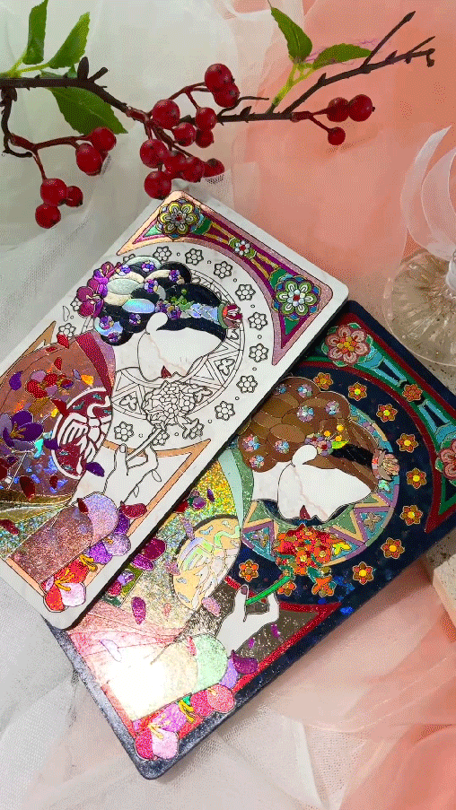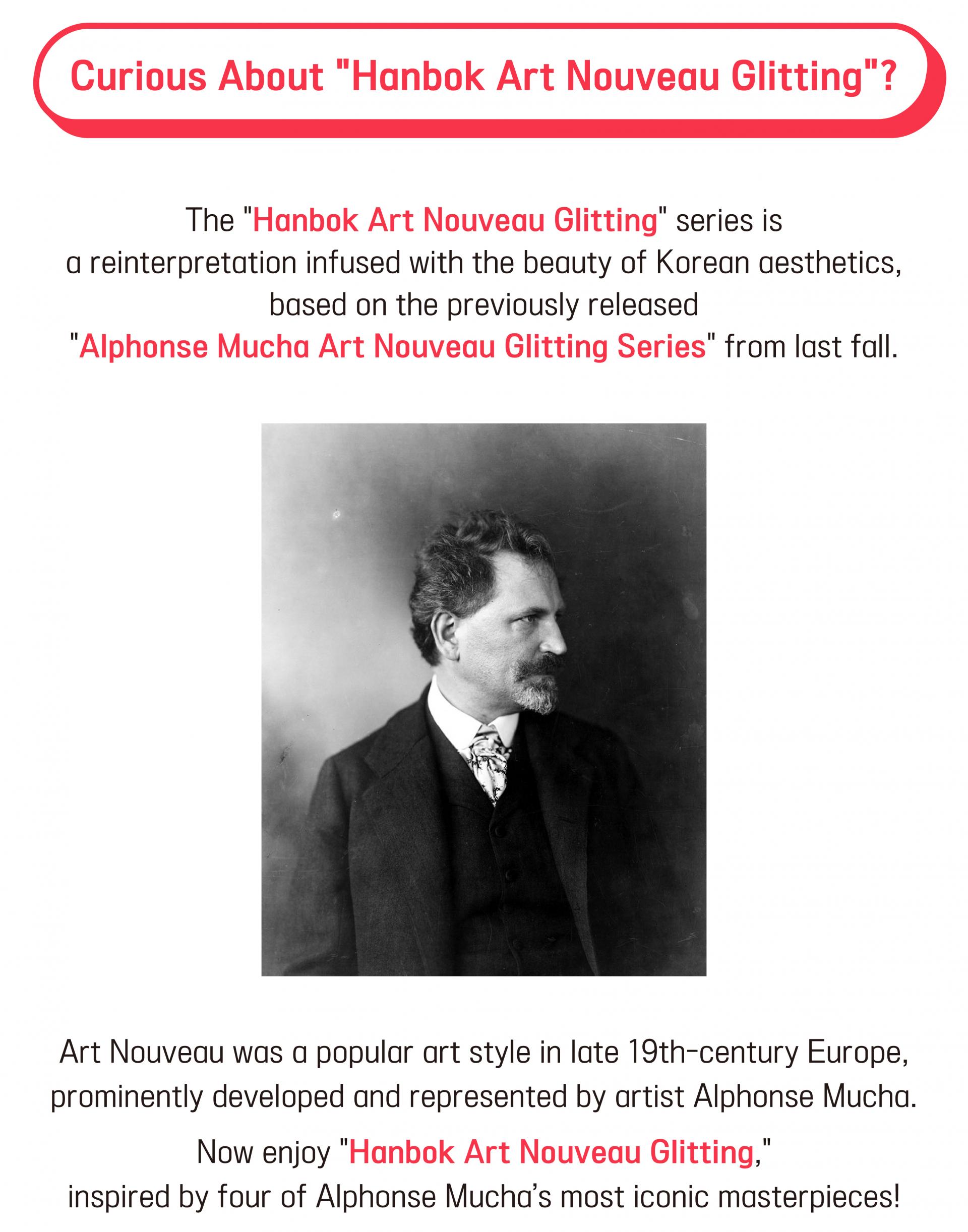 Brought vividly to life through Glitting’s mesmerizing holographic colors, this series beautifully reinterprets Alphonse Mucha’s iconic Art Nouveau style with a touch of Korean elegance.